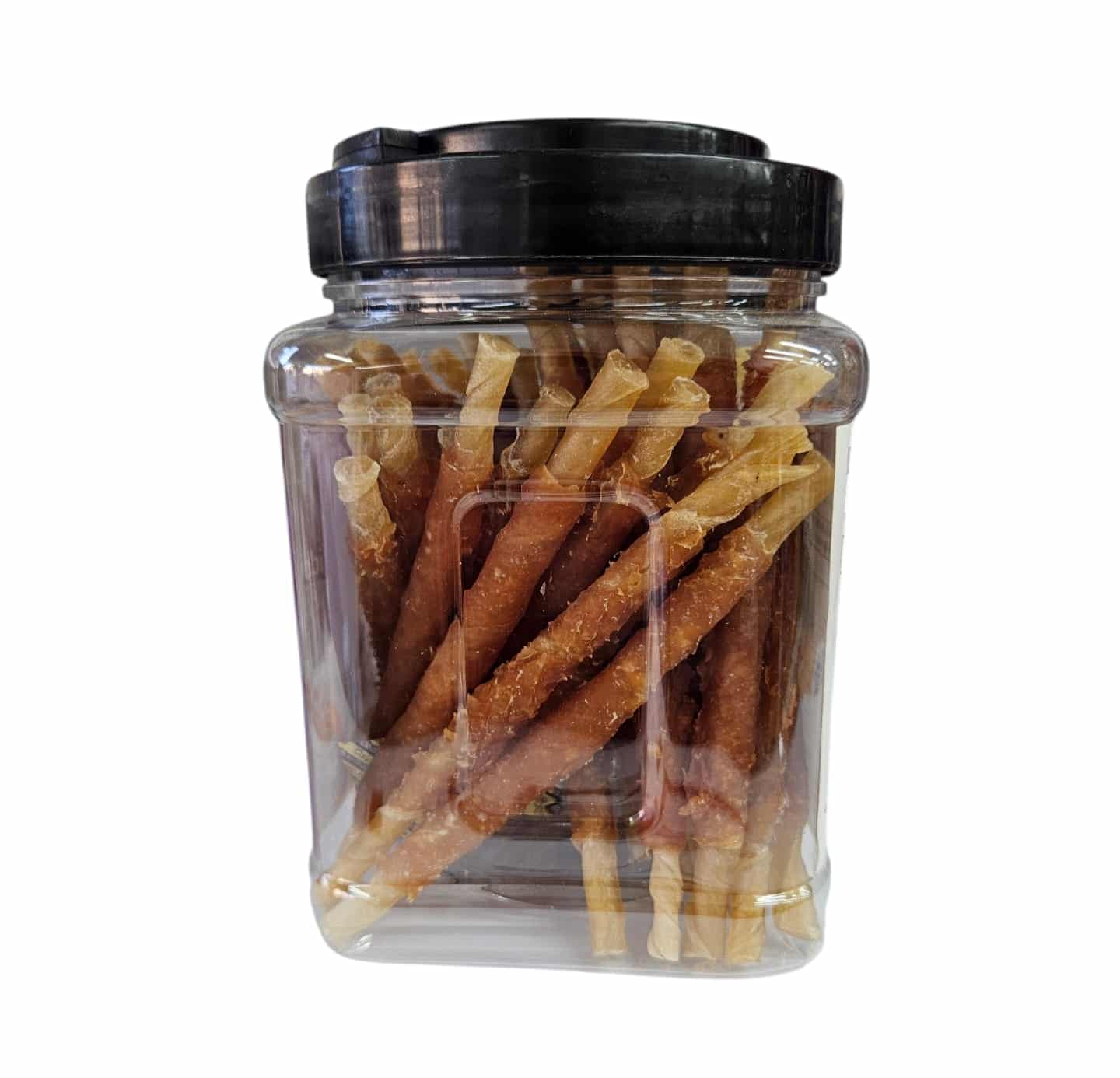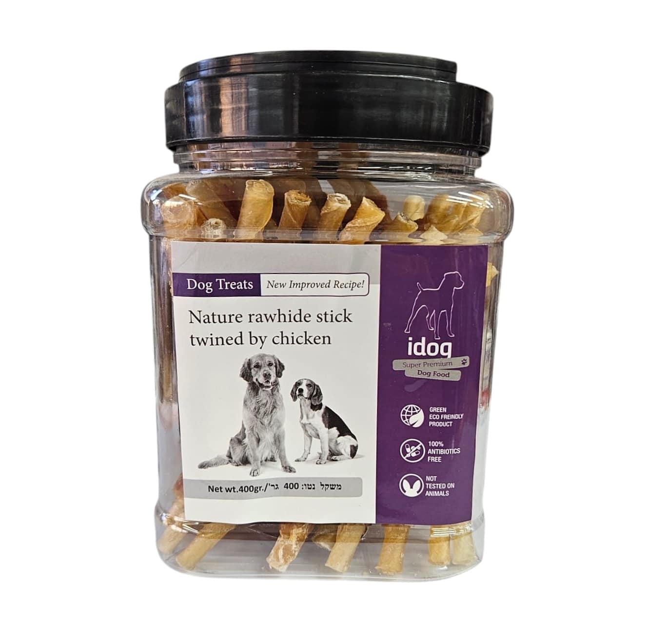 חטיף איי דוג מקל עור טבעי בציפוי עוף בצנצנת 400 גרם. חטיף רך משלים לכלבים טעים ואיכותי.