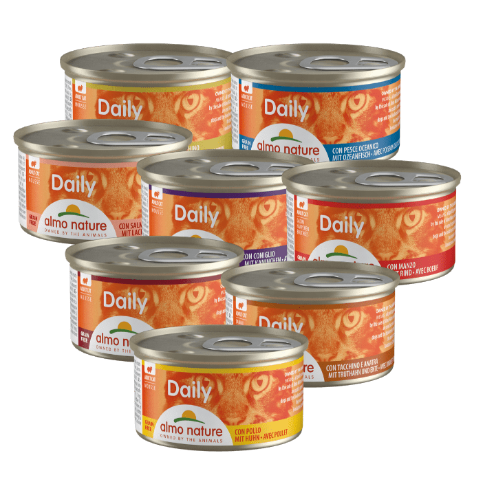 מוס ארנבת, מוס ברווז, מוס דגי אוקיינוס, מוס הודו, מוס סלמון, מוס עוף, נתחי בקר, נתחי דג פורל, נתחי הודו וברווז.