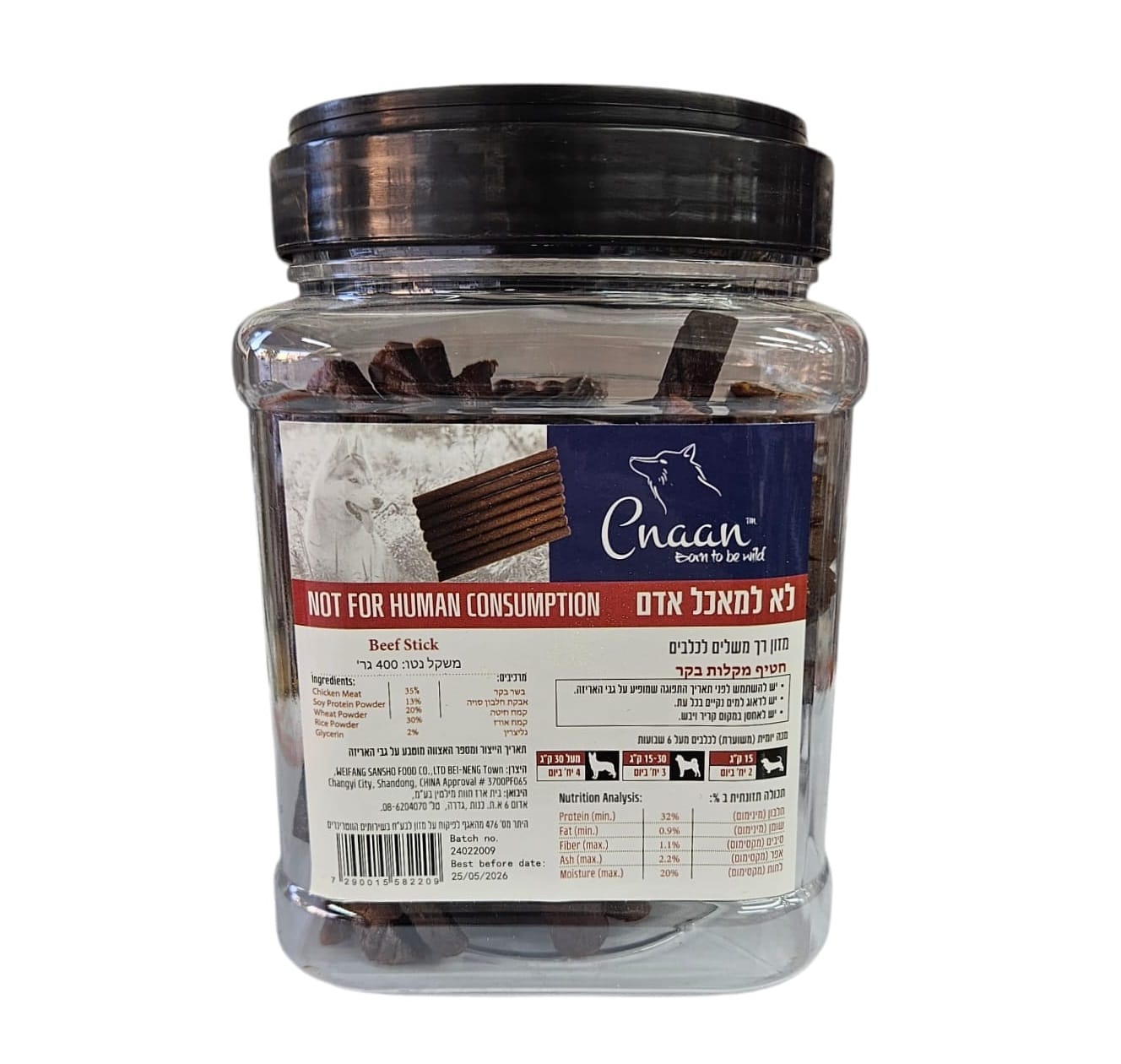 חטיף כנען מקלות בקר בצנצנת 400 גרם חטיף רך משלים לכלבים טעים ואיכותי.