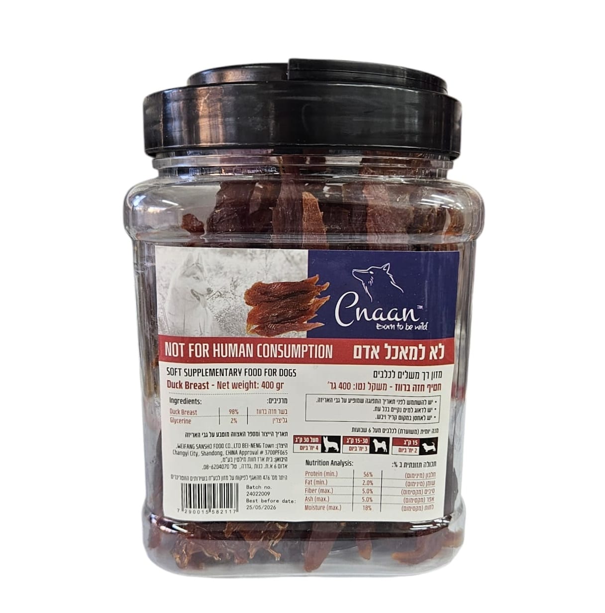 חטיף כנען חזה ברווז בצנצנת 400 גרם חטיף רך משלים לכלבים טעים ואיכותי.