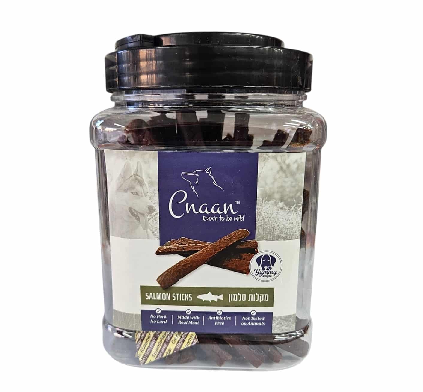 חטיף כנען מקלות סלמון בצנצנת 400 גרם חטיף רך משלים לכלבים טעים ואיכותי.