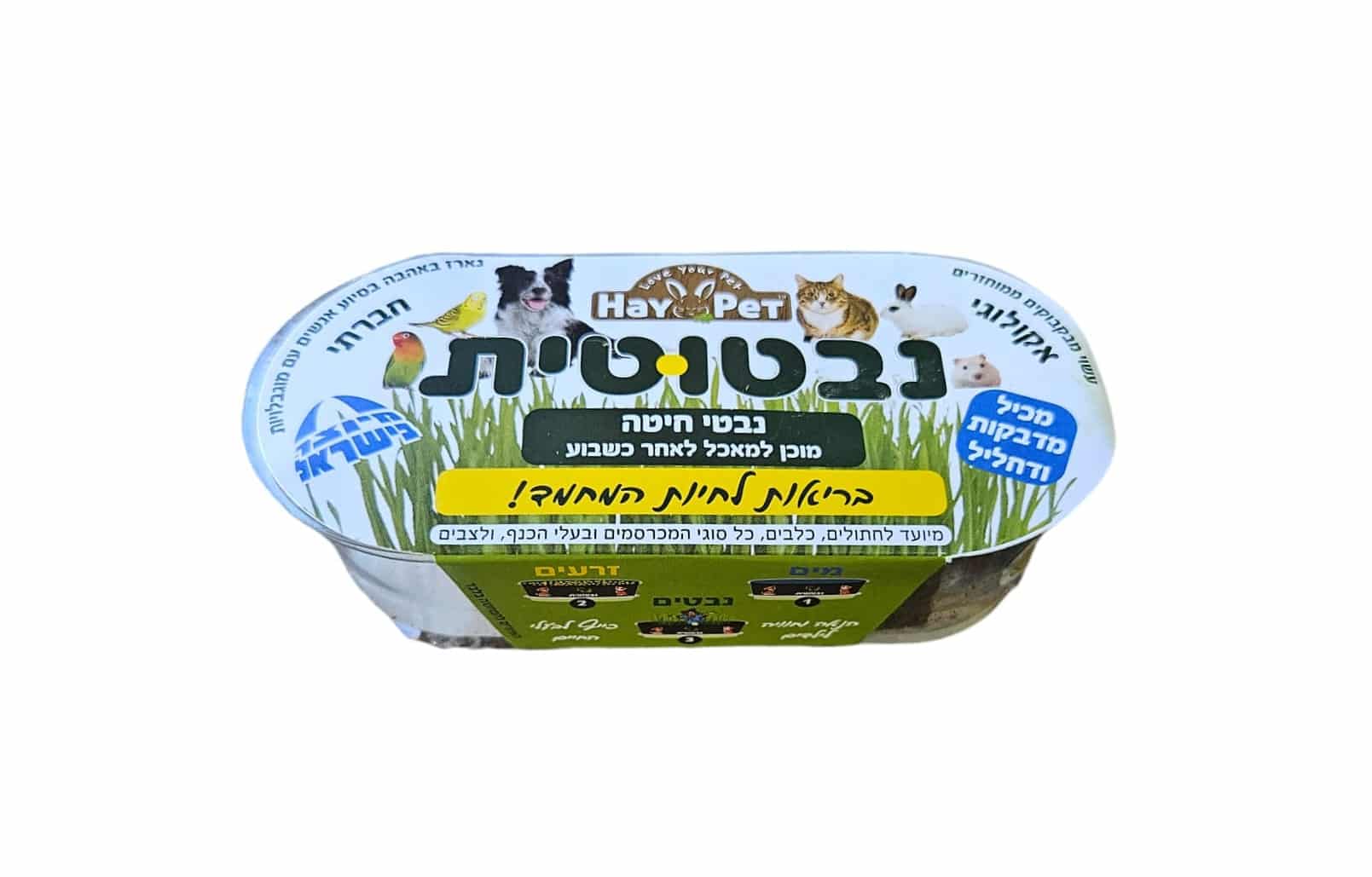 נבטי חיטה לגידול ביתי מוכן למאכל לאחר כשבוע ימים. מגיע עם מדבקות לעיצוב. מיוצר בישראל. מתאים לכלבים, חתולים, מכרסמים, תוכים. תכולה: 35 גרם.